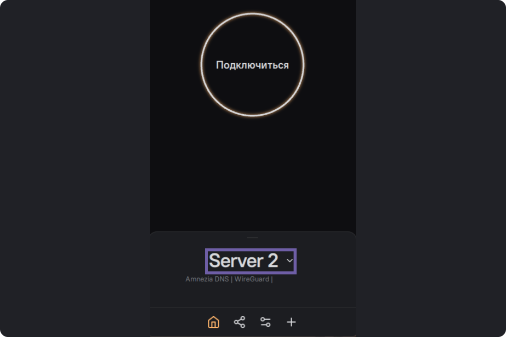 Откройте приложение Amnezia. На главном экране внизу кликните на название вашего сервера.