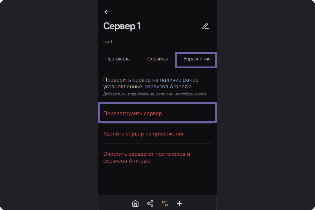 Найдите вкладку “Управление” Далее выберите перезагрузить сервер