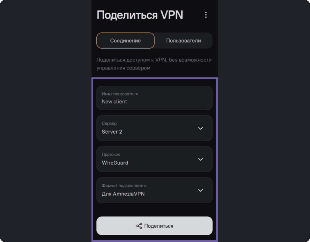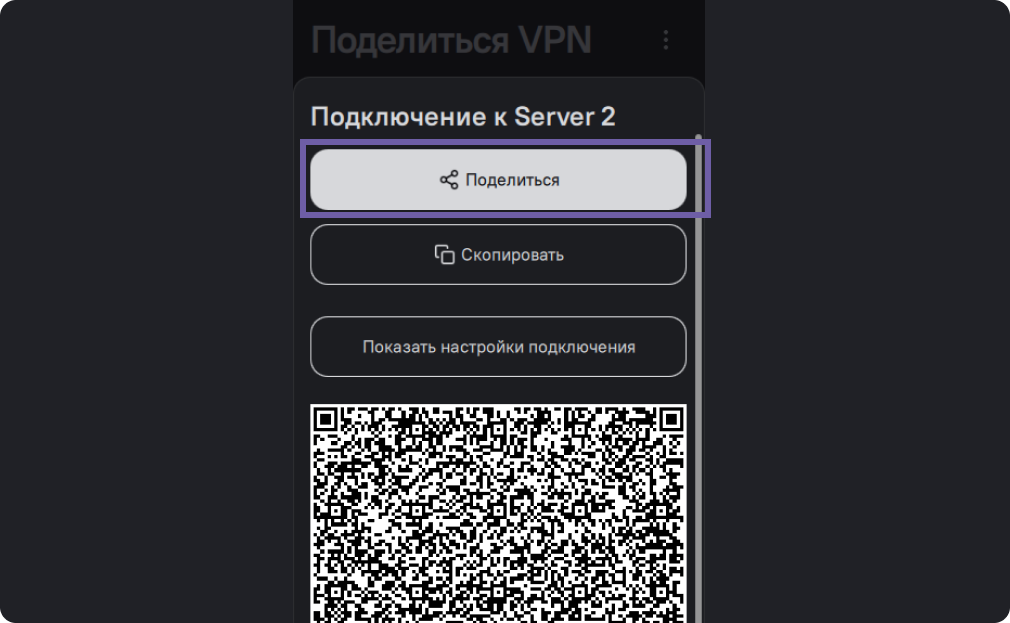 [Предыдущая страницаПодключение через QR-код](connect-via-qr- code.html)[Следующая страницаПредоставить полный доступ к VPN серверу](share- full-access.html)