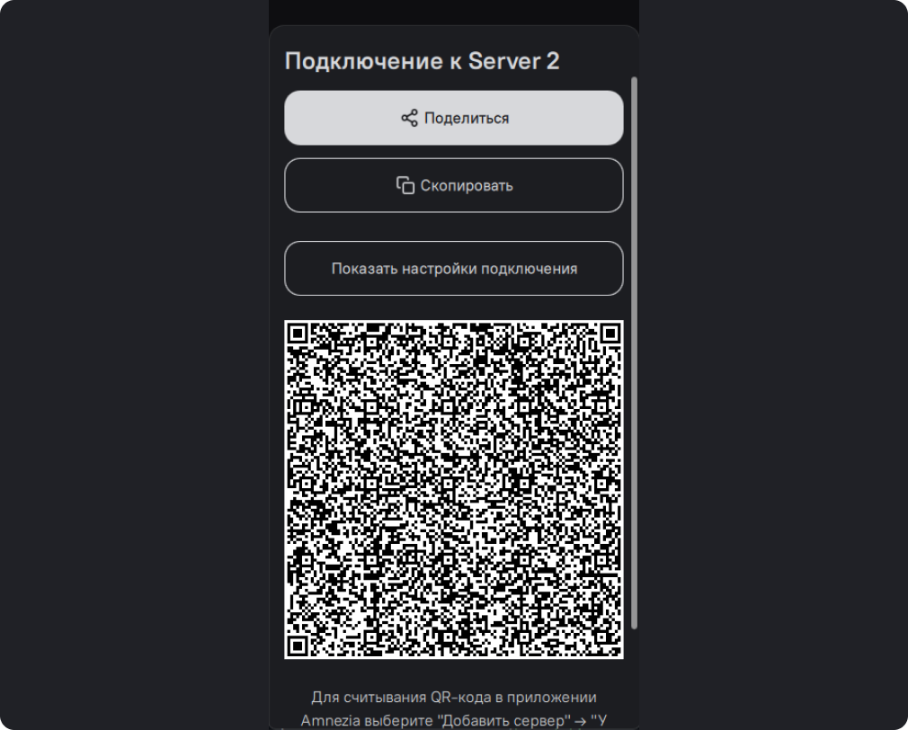 - Нажмите “Поделиться”, чтобы скачать файл конфигурации себе на устройство. Е�сли вы делитесь с помощью QR-кода, отсканируйте его с помощью смартфона или планшета.
