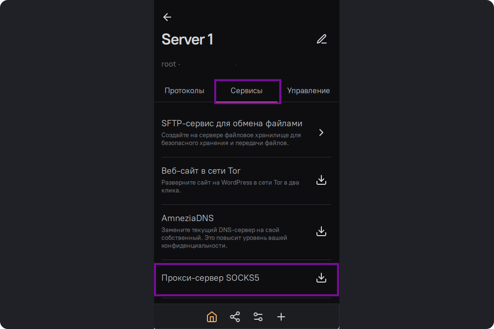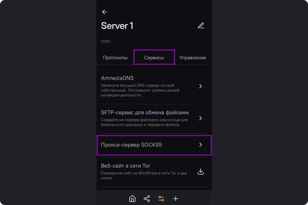 Во вкладке сервисы выберите SOCKS5 прокси-сервер.